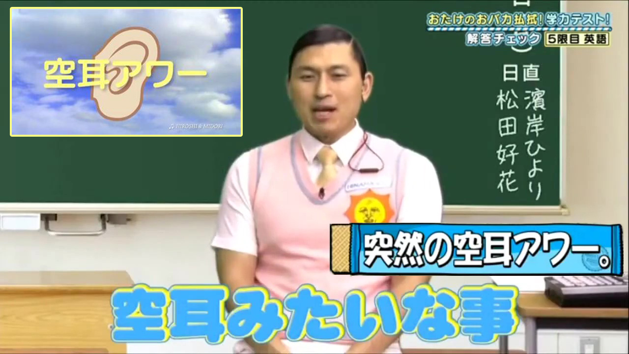 膝を「nezer」と答えた河田。英語の子供向けの歌『Head, Shoulders, Knees and Toes』で覚えたが、それがニーザーに聞こえたため。空耳アワーとは、1982年~2023年まで放送された『タモリ倶楽部』の人気コーナー。文字通り、洋楽の歌詞が日本語に聞こえるという企画。