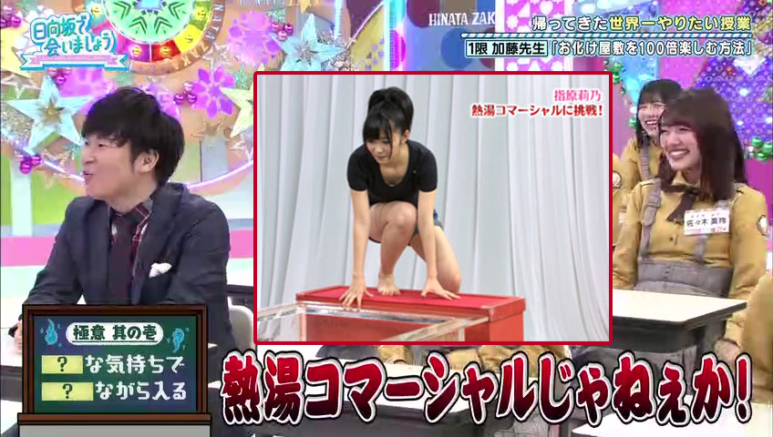 「お風呂に入りながらお化け屋敷に入る」という美玲のシュールなボケに対して。熱湯コマーシャルとは、1983~1999年に放送された『スーパーJOCKEY』の人気コーナー。宣伝したい人(大抵は女性)が水着に生着替えし、熱湯に浸かった秒数だけ宣伝できるという、今の時代ではあり得ないお色気コーナー。