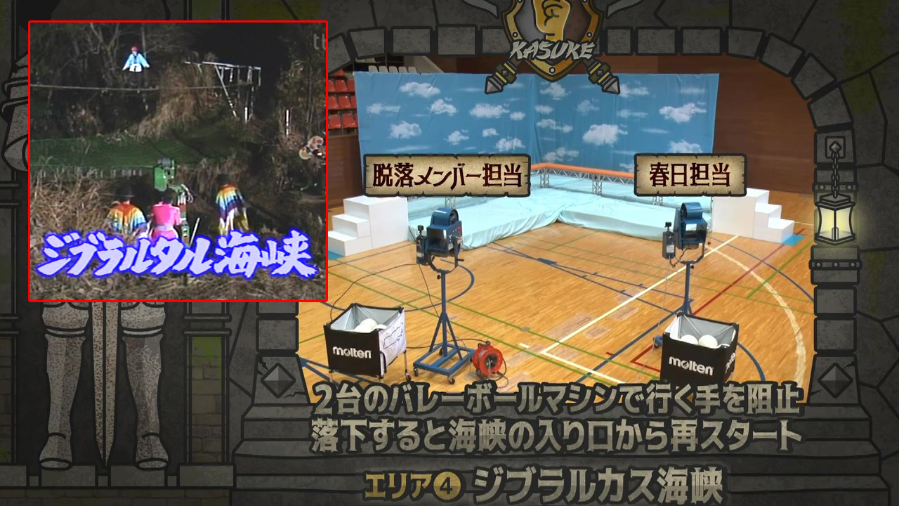 KASUKEのエリアの1つ。元ネタは1986~89年放送の『風雲!たけし城』に登場するジブラルタル海峡。不安定な吊り橋を渡るものだが、さらに横からバレーボールマシンで球が飛んでくるという仕掛けもある。